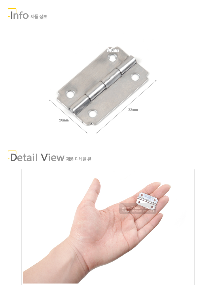 품 명 : 소품경첩/ OA-054 스텐 (20x32mm)규 격 : 20mm * 32mm (가로*세로) / 피스구멍지름 - 3.0mm재 질 : 스테인레스 스틸색 상 : 스텐유광용 도 : 작은 가구, 보석함, 작은 소품박스 등에 사용합니다.