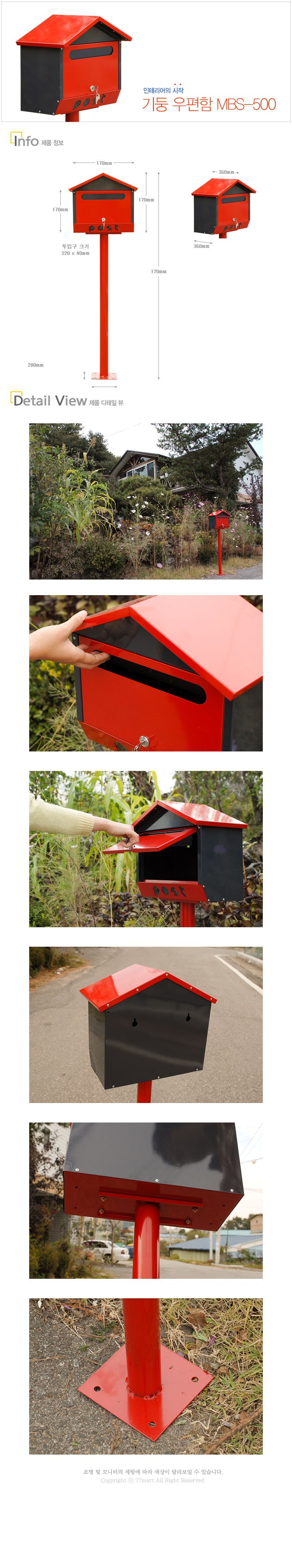품 명 : 기둥우편함 P04-059규 격 : 상세이미지를 참조하세요.재 질 : EGI 강철판마 감 : 외부용 분체도장구 성 : 우편함, 콘크리트 앙카볼트 4개특 징 : 우편함과 기둥에 체결되어 있는 볼트를 해체할 시 벽걸이 우편함으로 사용할 수도 있습니다.