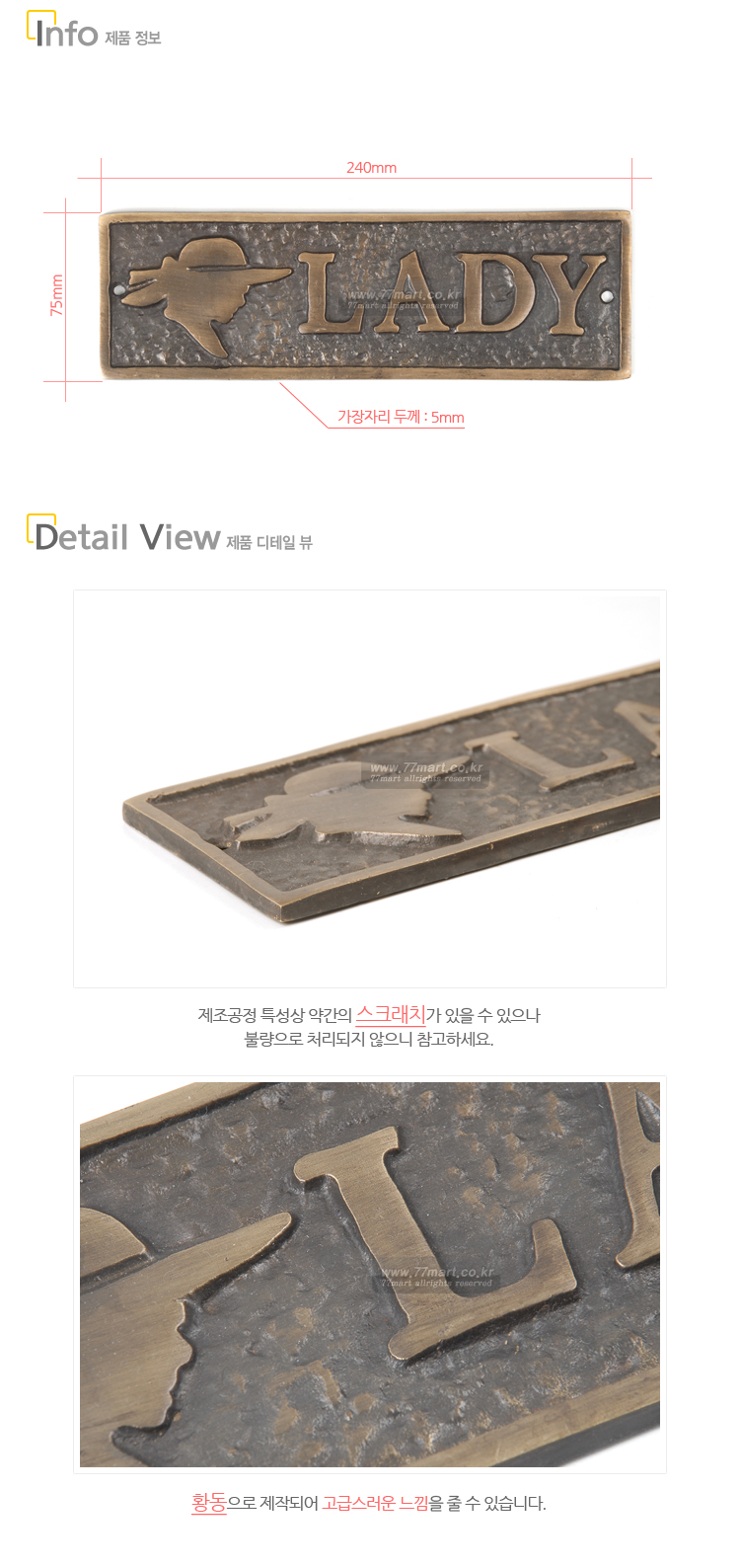 품 명 : 황동 화장실 안내판 LADY재 질 : 황동용 도 : 화장실 안내 표시판특 징 : 황동주물 및 수작업으로 제작된 제품으로 녹이 슬지 않고, 입체감이 있어 매우 고급스러운 느낌을 줄 수 있습니다.