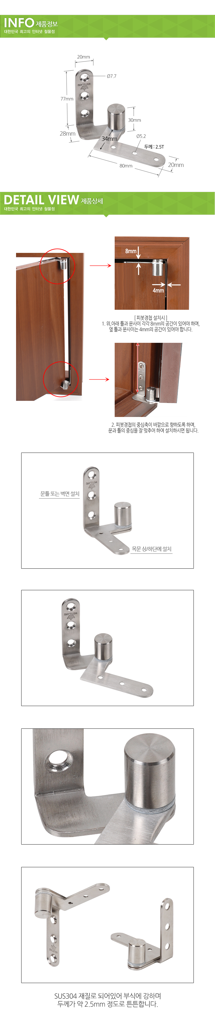 품 명 : 피봇경첩/ H02-086 SUS304 (2개 1조)규 격 : 상품 상세페이지를 참조재 질 : 스테인레스 스틸 SUS304마 감 : 헤어라인용 도 : 목문용으로 사용되는 피봇경첩구 성 : 피봇경첩 2개(상/하)